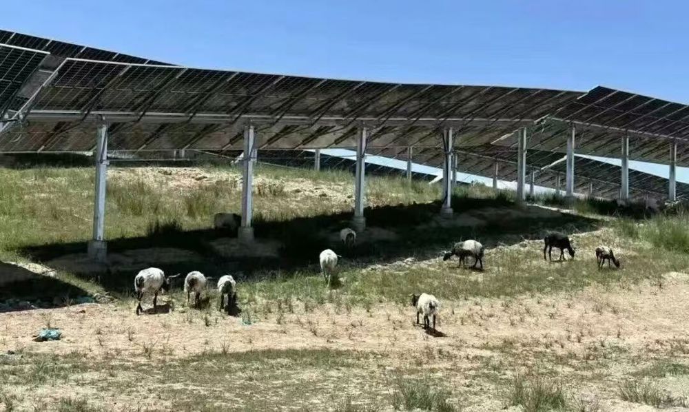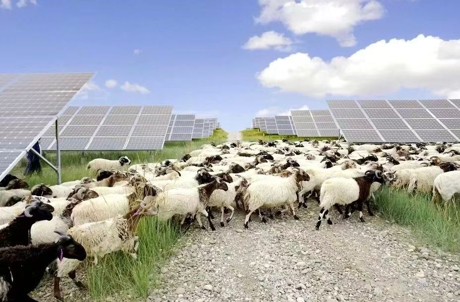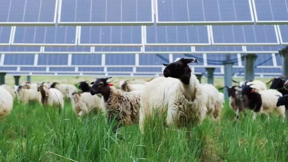 “在中国西北部的青海省,太阳能电池板下的草长得太快了,割草成本非常高。解决方案?羊。它们吃草、它们施肥,我们得到清洁能源和羊肉。”