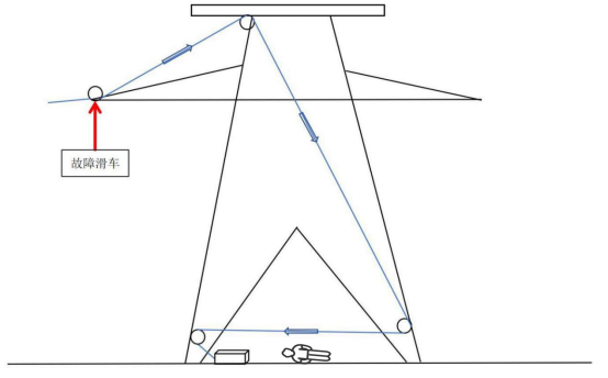 施工项目部在进行G147塔至G166塔放线过程中,导线受载方向发生变化,起重滑车横梁和侧开口板分离,绞磨机钢丝绳从滑槽中滑出,快速弹起,打断耿超银防坠器钢丝绳,致耿超银从20m高处坠落至地面死亡。耿超银高空作业未按“双保险”要求将安全扣系挂在高处可靠部位,防坠器钢丝绳断裂时,安全带未起到保护作用,是导致其死亡的直接原因。