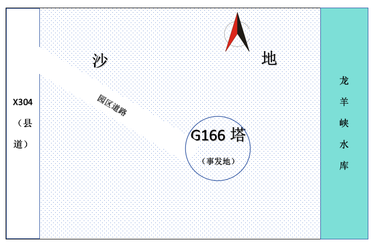 2025年2月28日上午11时许,共和县人民政府调查组进行了现场勘验;3月10日州人民政府事故调查组再次对事故现场进行了踏勘、调查、模拟和询问事发当时的目击者:事发地为铁盖乡吾雷村吾雷塔拉台工地,该工地南北两侧均为沙地,东侧为龙羊峡水库,西侧为X304县道,事发地通过园区道路与X304县道接壤(位置示意图见图1);事发当时人员作业的线路距地面垂直高度约20m,耐张塔底部横担距地面高度约20m,死者坠地处距作业点水平投影距离约10m(现场示意图见图2);事故现场地面有钢丝绳、绞磨、瓷瓶、防坠器、木条等工器具、材料随处放置;事发当时高空作业人员有耿超银、张刚、赵庆宣等五人,地面人员有黄泓翔等8人。