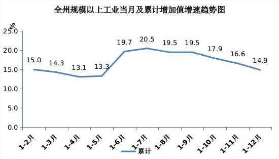 (一)规上工业高位运行,创五年来历史新高。全年,全州实现规上工业增加值增长14.9%,较2020-2023年分别高9.4、11.5、18.9和11.7个百分点,创五年来历史新高。从门类看,全部实现“两位数增长”。全州规模以上制造业增加值增长30.9%,增速较前一季度、上半年、前三季度分别高23.8、24.0和14.8个百分点,占全州规上工业的3.6%,拉动全州工业增加值增长1.3个百分点。规模以上电力、热力、燃气及水生产和供应业增加值增长14.2%,增速较前一季度、上半年、前三季度分别低0.3、6.1和5.5个百分点,占全州规上工业的96.4%,拉动全州工业增加值增长13.6个百分点。
